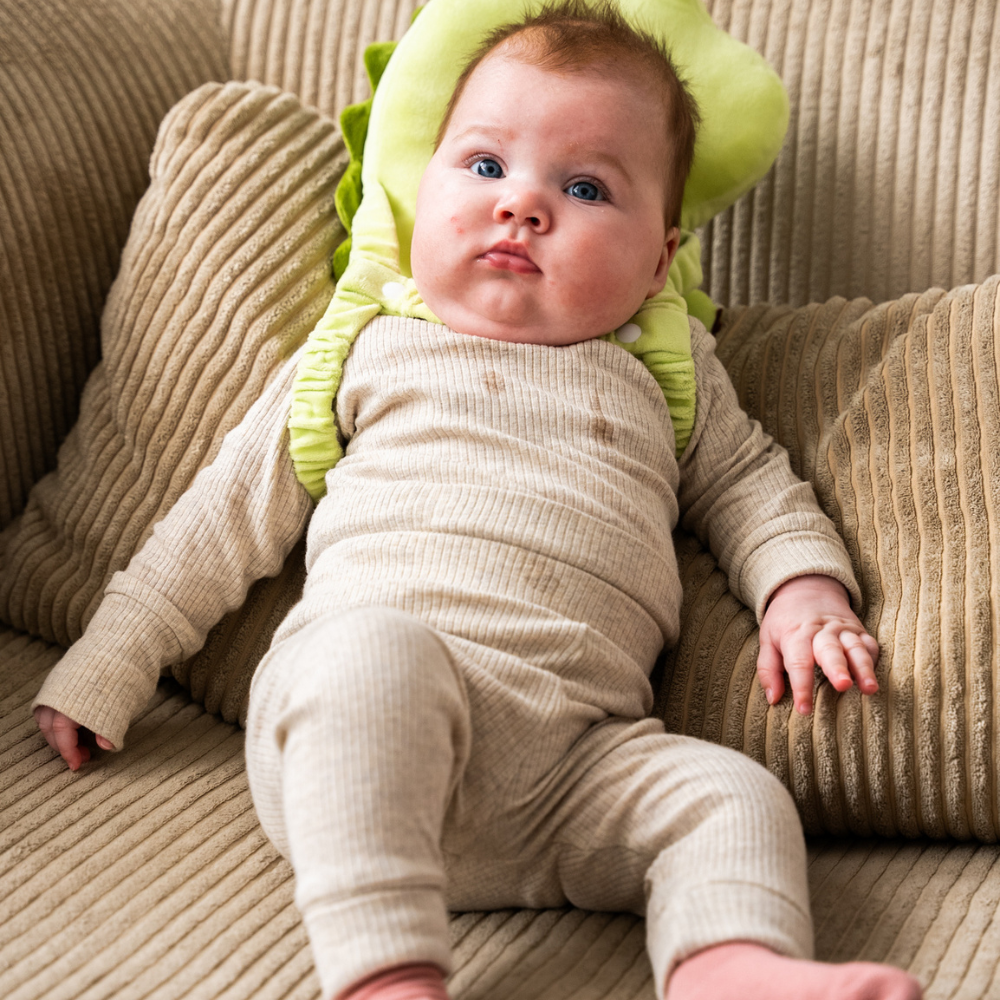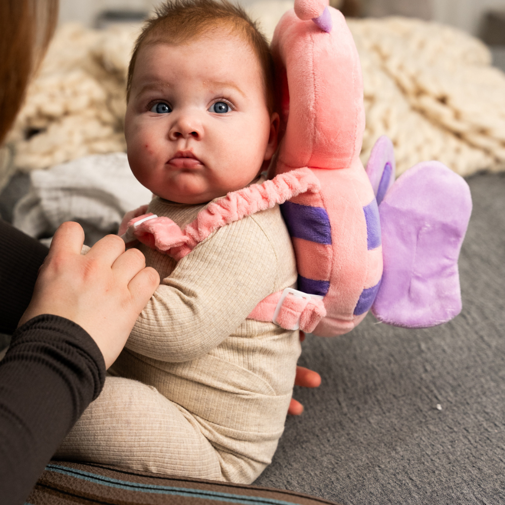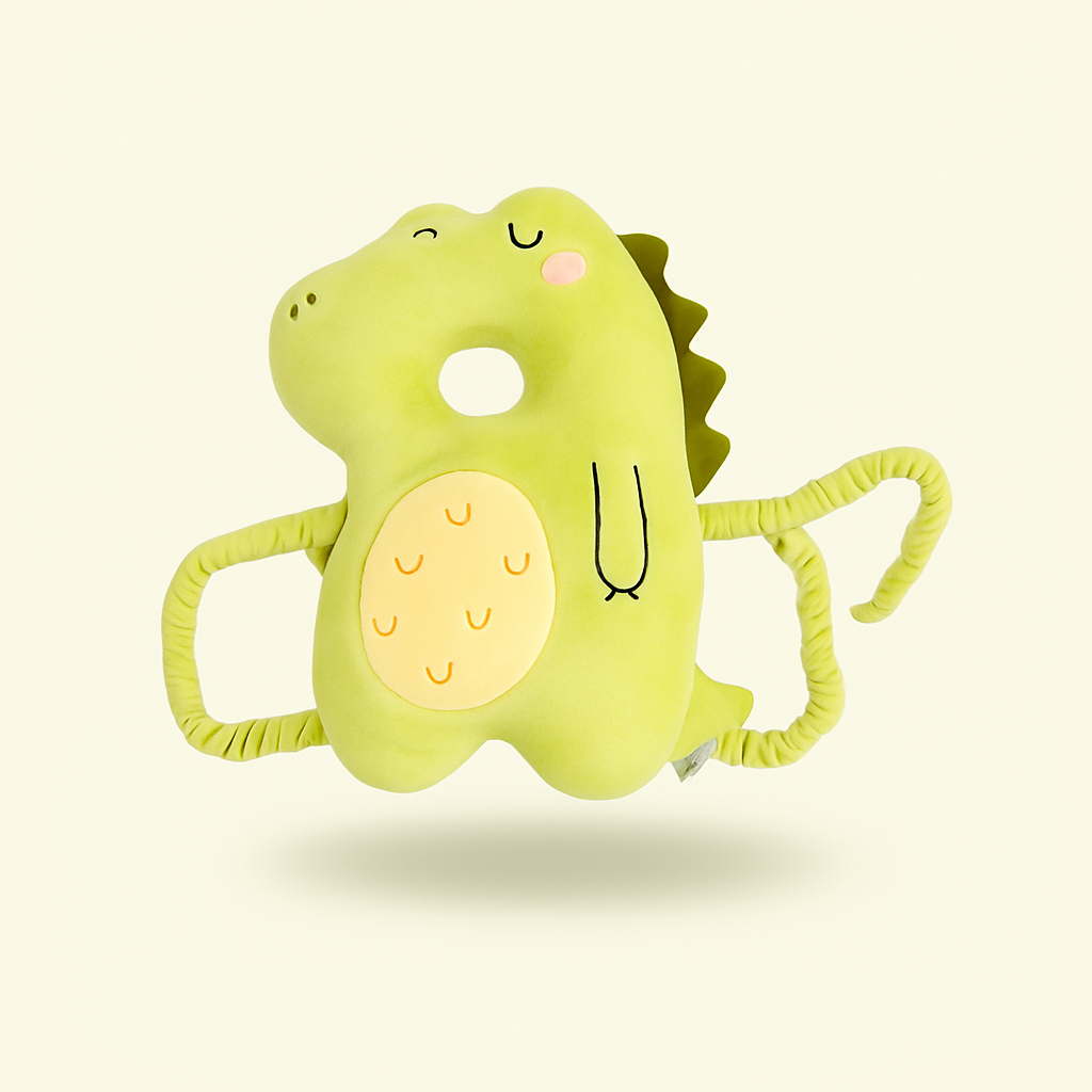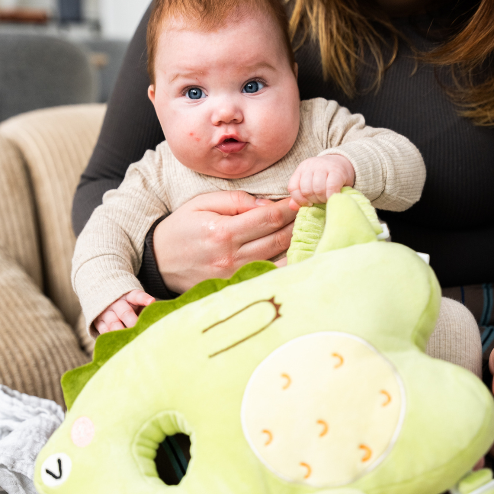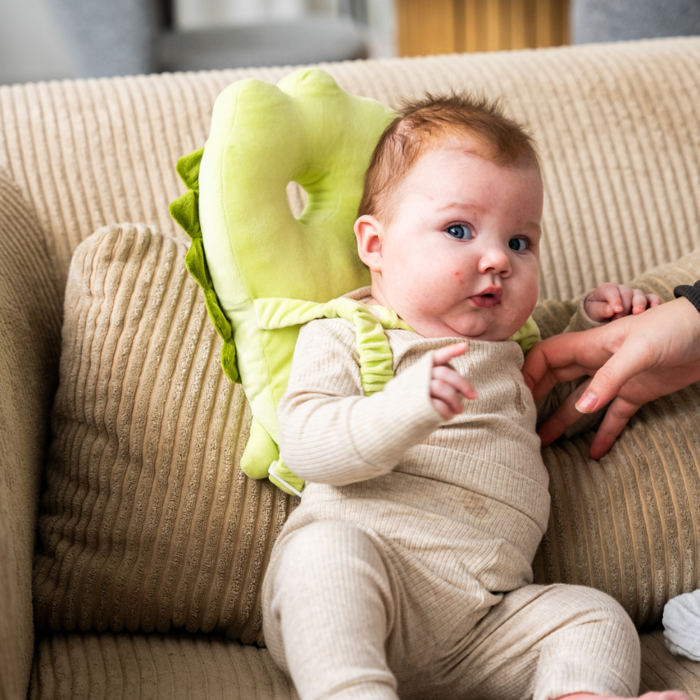 Så snart dit barn begynder at sidde op selv og forsøger at rejse sig, kan puden hjælpe med at beskytte baghovedet mod fald – typisk fra ca. 6 måneder og op.